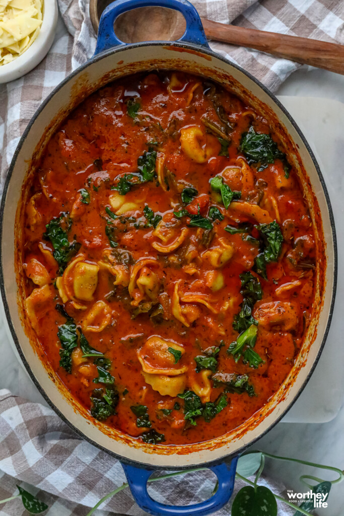 It’s made with tomatoes, sausage, chicken stock, a plethora of seasonings, and a spinach and cheese tortellini pasta.