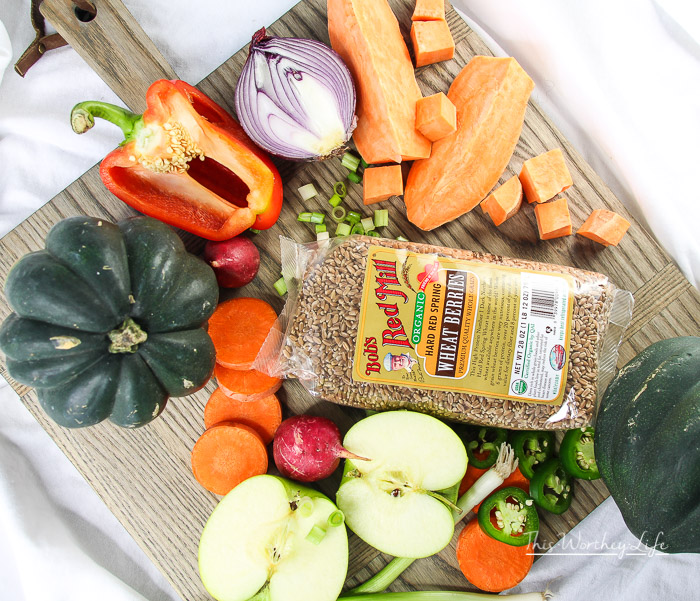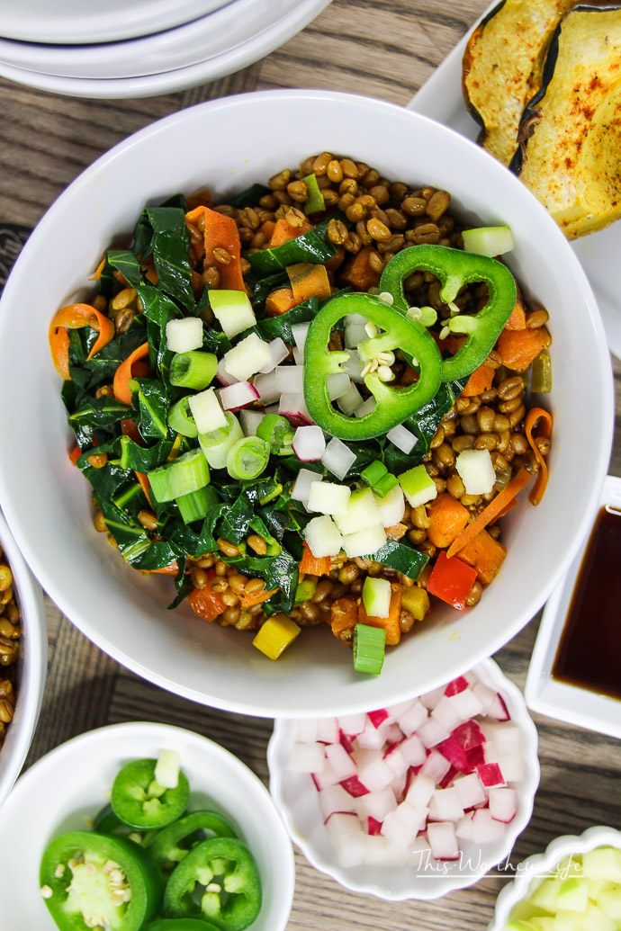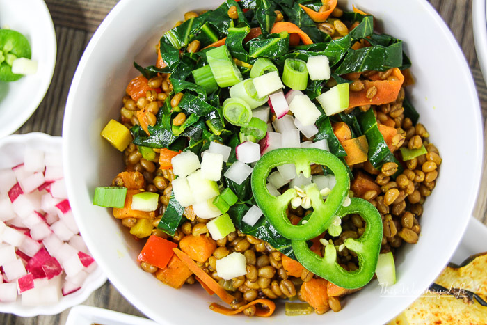 This vegetarian bowl is a healthy, delicious grain recipe that is also hearty and will have you coming back for seconds. We made the wheatberry in the Instant Pot and it turned out amazing. Our Turmeric & Garlic Wheat Berry Bowl + Veggies recipe is one to add to your list of healthy recipes to try this year!