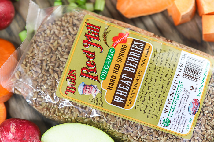 What is a wheatberry anyway? Whole wheat berries have wheat kernel left intact, so virtually none of the nutrients are stripped away. A single cup of cooked wheat berries has about 300 calories and is jam-packed with fiber, protein, and iron. And wheat berries mixed with a colorful mix of veggies makes for a tremendously nutrient dense meal with tons of energy generating goodness!