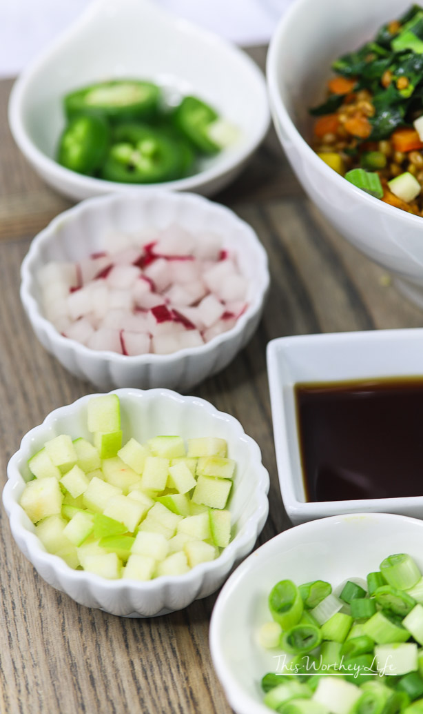 - Spoon into serving bowls and top with diced radishes,jalapeños, and green apples.