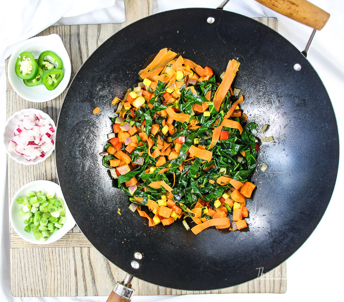 - Place a wok over med-high heat and add two (2) tablespoons of extra virgin olive oil, when the oil is hot add the sweet potatoes, carrots, squash, collard greens, and red onions.