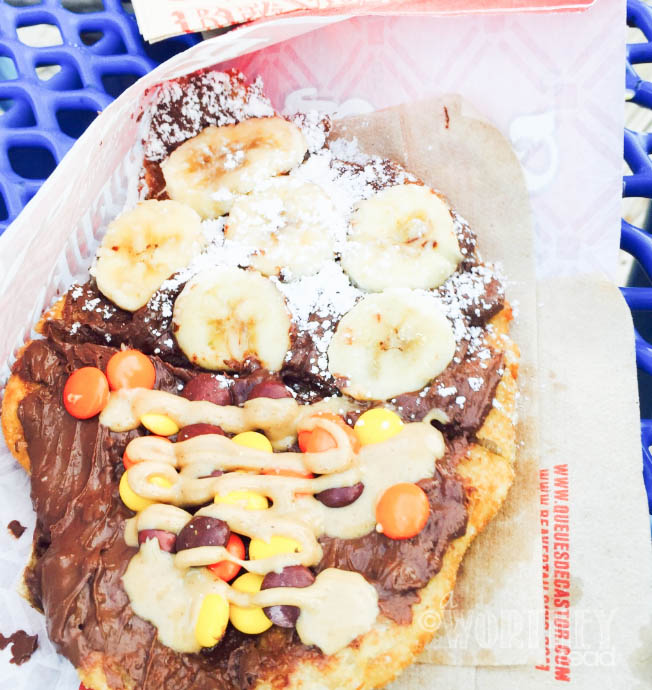 If you spend enough time on the boardwalk you’re going to eventually get hungry. The smell of food is unavoidably everywhere. Practically every couple of feet there’s a restaurant with something yummy to sell you and that’s a good thing. Inside our hotel room, there was this cool and very informative book titled, Where To Eat, Shop, Stay and Play in the Wildwoods by Exit Zero Publications. When you open up it is overflowing with all manner of entertainment options, can you say overwhelmed? But it is the food recommendations that will make you drool. While thumbing through the pages we encountered something we hadn’t seen before, BeaverTails®. It turns out “beavertails” are a fried whole-wheat pastry kinda like a funnel cake or churro, except this one, is long and flat like a beaver’s tail, hence the name. And, in addition to being topped with sugar or cinnamon, this tasty treat can be loaded with a lot of different toppings ranging from chocolate hazelnut spread and bananas or chocolate hazelnut spread topped with Reese’s® Pieces and peanut butter. These babies border on dangerously addictive. No lie.
