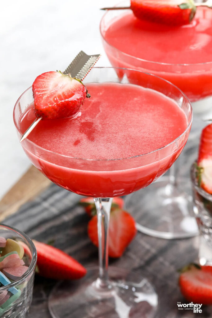 - Garnish with two strawberry halves on a cocktail stick.
