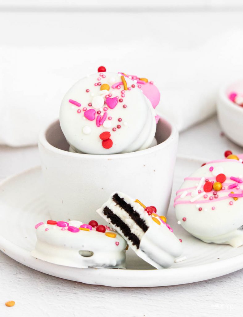 White chocolate-covered Oreos are always a hit. Add on some pink sprinkles that give it that romantic feel, and these Oreos will win over anyone!