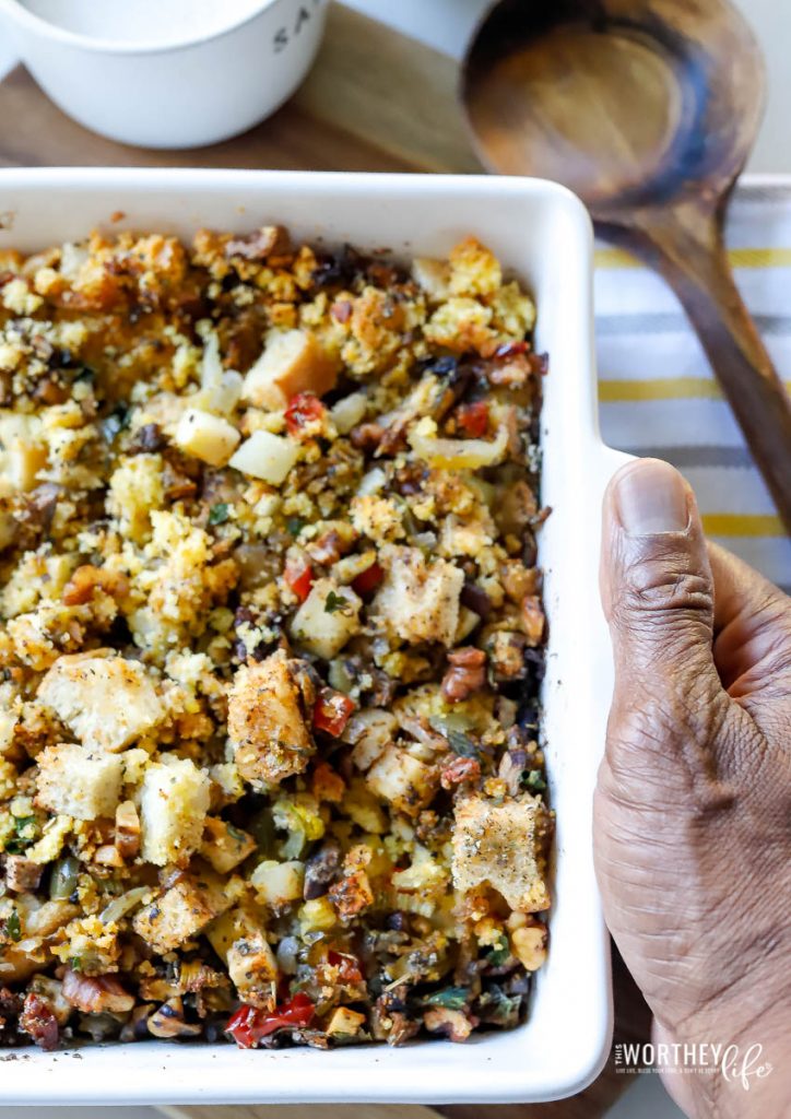 Plus, I have a cheat for the cornbread that will make it even easier for you to put this mouthwatering dressing in the oven and on your Thanksgiving table as soon as possible.
