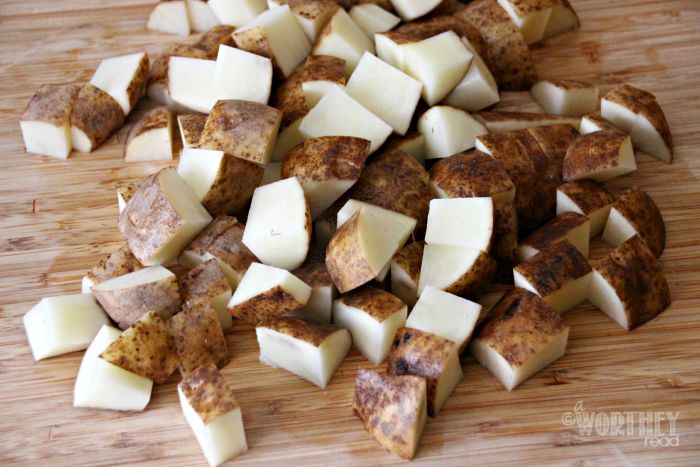 - Thoroughly scrub and quarter potatoes, then place them in a large pot. Cover with water and add a pinch of Kosher salt; bring to a boil over medium-high heat; cover partially and cook for about 25 minutes or until tender. Drain and cool completely.