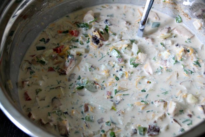 - Whisk together the mayonnaise, heavy cream and Dijon mustard in a large mixing bowl.