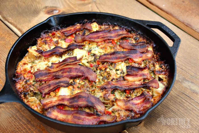 - Transfer the mixture to the skillet, spreading it evenly. Scatter the bacon pieces on top.