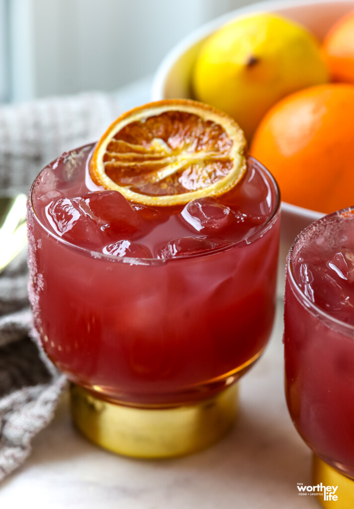 Rose Sugar and Dehydrated Orange. We added a little razzle-dazzle by adding dusted rose sugar to the side of the glass. Yes, it’s a little fancy, but we think it is an amusing idea that makes this drink pop! Add a dehydrated orange slice and cherry on top to make this drink pop!