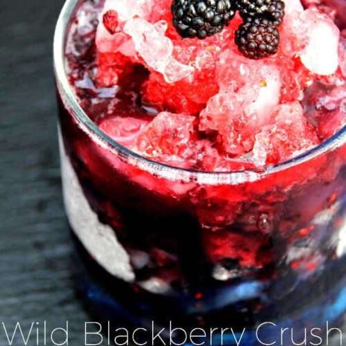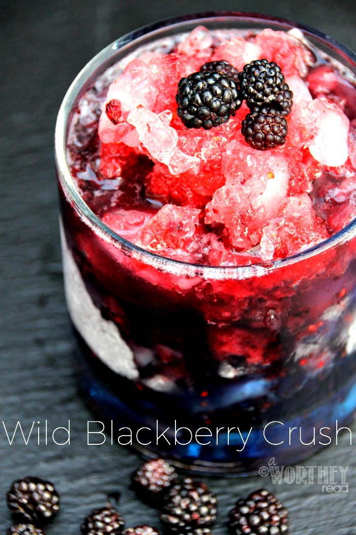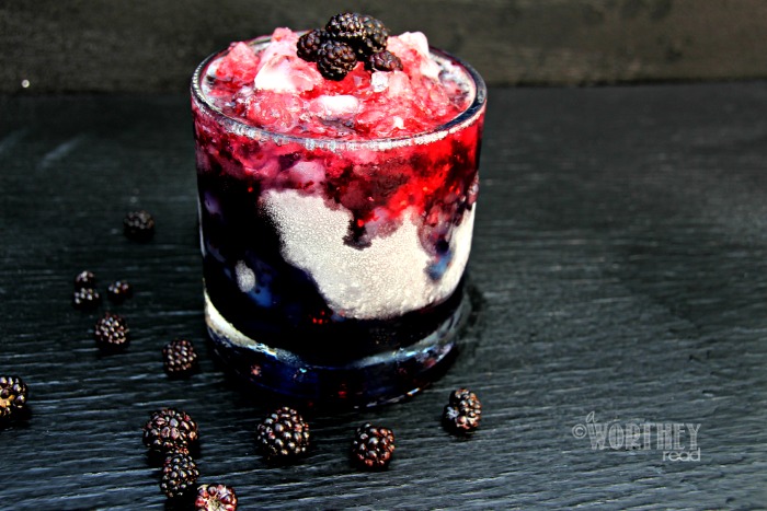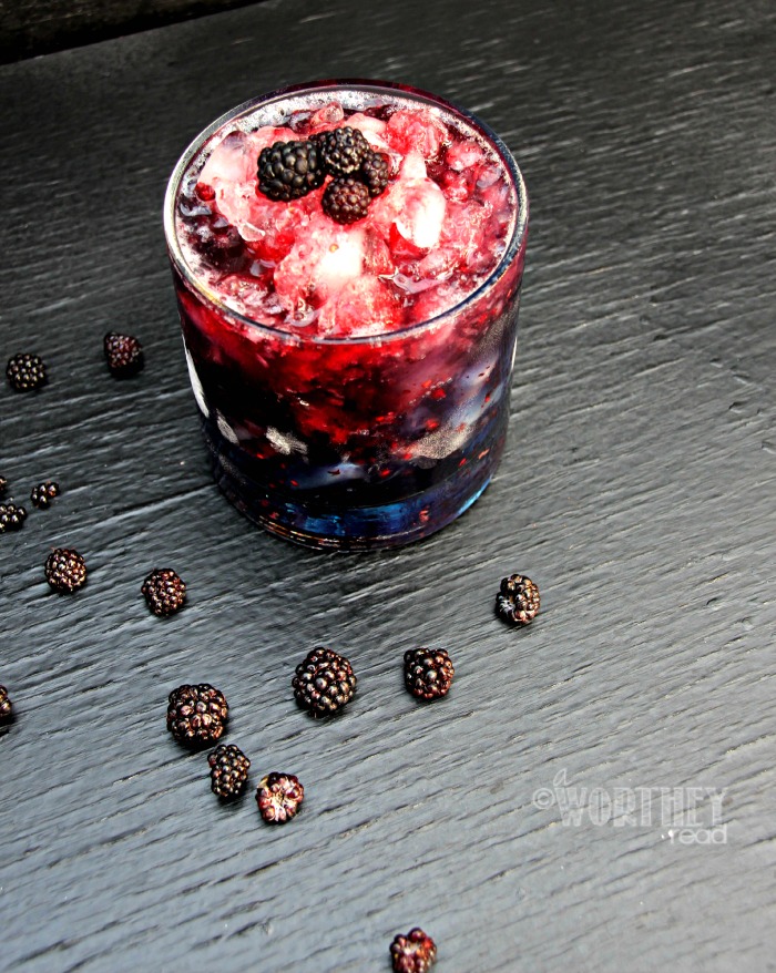 • In a food processor or blender add 5- 6 ice cubes and 15 blackberries and pulse until ice and blackberries are incorporated. Spoon ice and fruit mixture into a whiskey glass about 3/4 full. Add 1 shot of gin, 2 ounces of