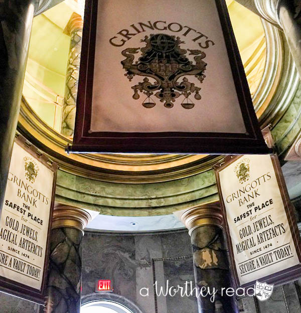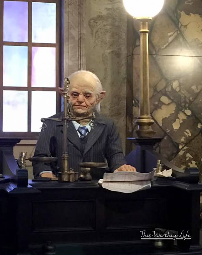 Then, in addition to the dragon, the bank sits at a twisted angle, and the building is so neat, both inside and out. The line for the ride is like the Hogwarts castle, it has tons of details throughout it to entertain you, and they even offer to take pictures for you at one point in the line. The main lobby part of the bank is fantastic, with the working goblins at the counters.