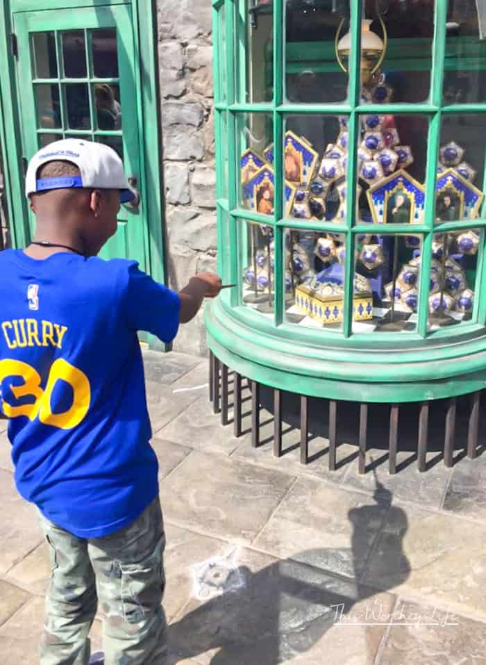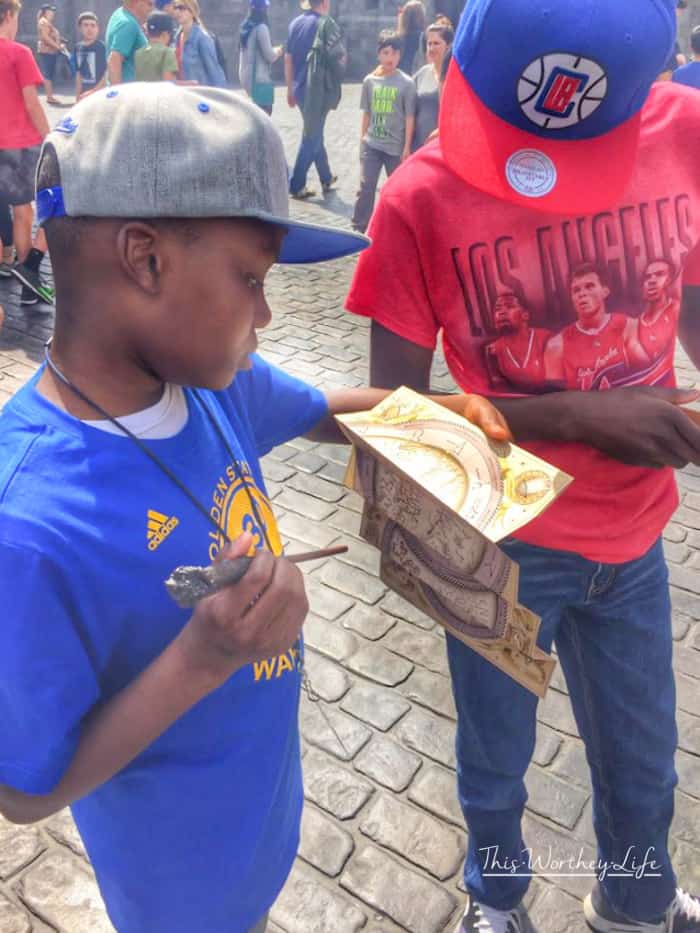 Ollivander’s Wand Shop. You can actually do this shop in both parks, and I would say that typically, the line for the one at Universal seems to be shorter than the one at Islands, as far as I have observed. There is a “show” to see, which is great, where Ollivander comes out and chooses a wizard from the group, and helps them find their own wand. On our first favorite, Zayd’n was chosen to come up and Mr. Ollivander helped him select a wand. He loved every minute of it!