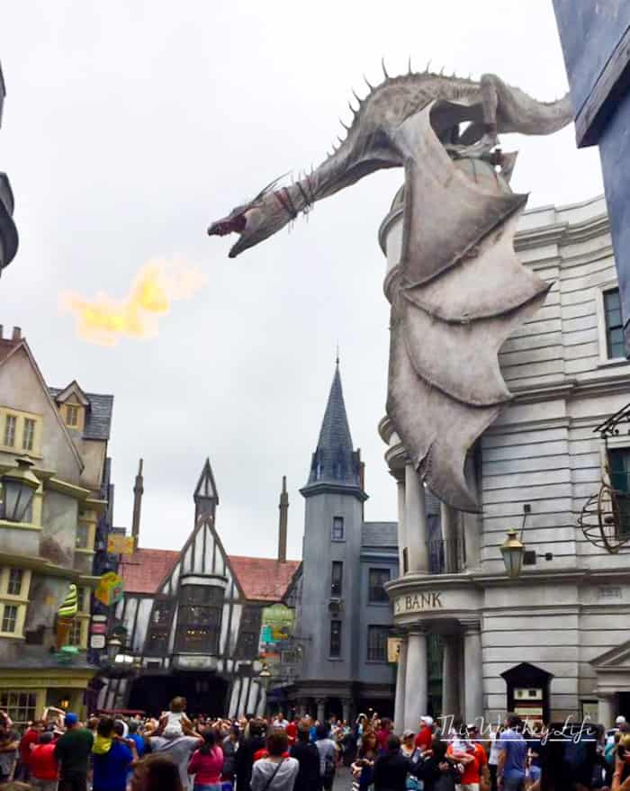 Gringott’s Bank Ride. This is my family’s favorite Potter thing out of both parks. The bank itself is easily the coolest thing to see and they have strategically placed it far back so that the view is not ruined for you until you are meant to see it. Perched on the top of the bank is the famous dragon who gives them a ride out in the movie, and it looks legit, let me tell you. When it is not too crowded, I love to just sit there and really study it.