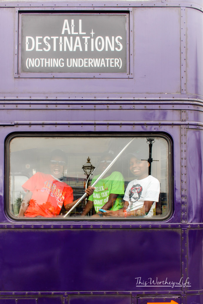 Knight Bus.  Outside Diagon Alley, and across the street in the London area in Universal Studios is where the Knight Bus sits. It is a clue for those who are looking for where to enter the Wizarding World, as they do a good job tucking it in and behind the main streets there. You can’t miss the purple two-story bus as you come down that street and the driver and his talking shrunken head will chat with you, and take photos if you choose to stand in the line. Sometimes the line is very minimal, too.