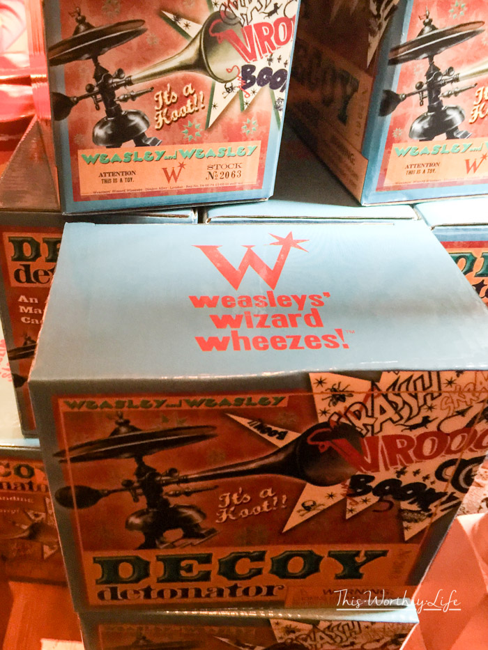 The shops are really great to see inside, with the neatest details, like an upside-down broom that is sweeping the ceiling and walls full of vintage looking wand boxes.