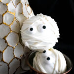 Important: Because these truffles have a very soft center, it is crucial to dip them in white chocolate twice. The first time you dip the truffles in white chocolate, some of the dark chocolate will mix into the white chocolate and turn it a marbled white/brown. Dipping them in fresh white chocolate again ensures that you will end up with perfectly coated, bright white mummies.