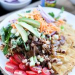Arrange the pan-fried corn tortillas on a plate, spoon the rice and pork mixture over the tortillas, add the black-eyed peas, sliced avocado, tomatoes, collard greens, and onions. Top with cubed tomatillos, shredded cheese, cilantro, and El Yucateco XXXtra hot sauce.