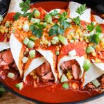 Repeat process until the skillet is filled with enchiladas. Fold the enchiladas and cover with enchilada sauce, more shredded Mexican cheese, and green onion.
