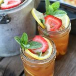 In a large punch bowl or large pitcher combine sun tea, Jack Daniel's Rye Whiskey, strawberry + lemon simple syrup, lemon juice, lemon and strawberry slices, and fresh sprigs of mint. Mix well and ladle into mason jars filled with fresh ice, lemon and strawberry slices. Garnish with sprigs of mint, then serve.