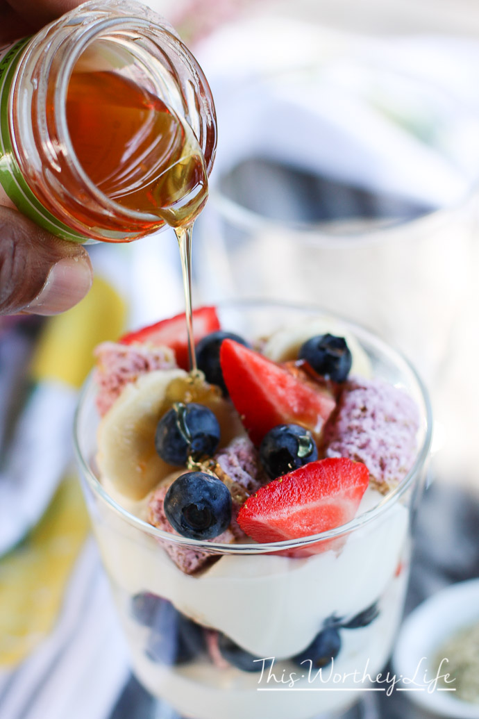 - On top of the final layer, drizzle on 1 to 2 tbsps of honey.