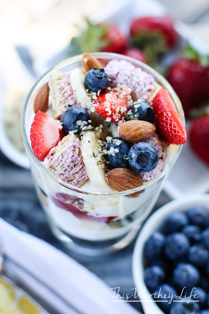 This easy parfait recipe with fruit idea is perfect for the summer or back to school season. Kids and adults get all of their morning servings in just one little cup mixed with frosted mixed berry shredded wheat, yogurt, and fruit!