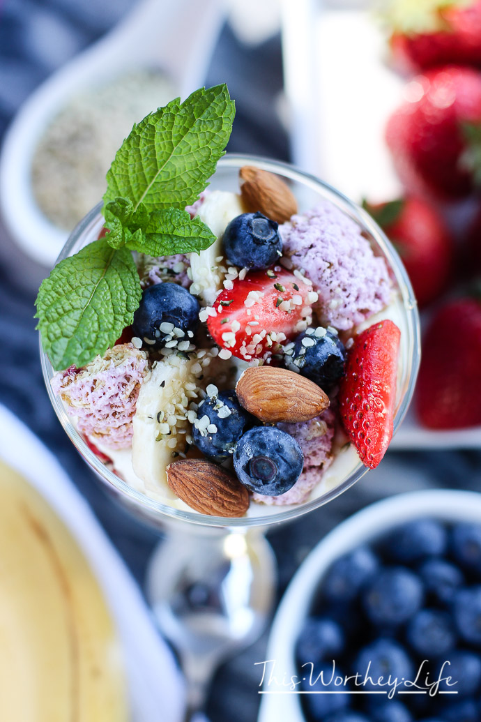 If you have ever made a parfait then you will have no problem at all making these easy and delicious yogurt cups. Or get the kids in on the fun and supervise as they use yogurt and lots of their favorite fruits to create custom made yogurt cups all by themselves! We used banana and strawberry slices, juicy blueberries, hemp hearts, California Almonds, and organic honey. But the star of the show was definitely the Post® Shredded Wheat Frosted Mixed Berry cereal! Each little blueberry frosted square is stuffed with real berry goodness inside! But not just good, this is 100% whole grain shredded wheat goodness! In addition, Post® has two other scrumptious flavors too! Check out their Frosted Cinnamon Roll and Frosted S’mores Bites Shredded Wheat. Tell me these don’t sound wonderfully delicious. And you may want to come back and visit because I am going to show you a couple of fun and very easy recipes you can create with those delicious Post cereals as well! Or use your imagination and create your own. With these new Post cereals with just a few additional ingredients, it is super easy to spruce up ice cream, smoothies, and breakfast bars. So, whether it’s breakfast, lunch or dinner time the possibilities are pretty much endless. YAY!