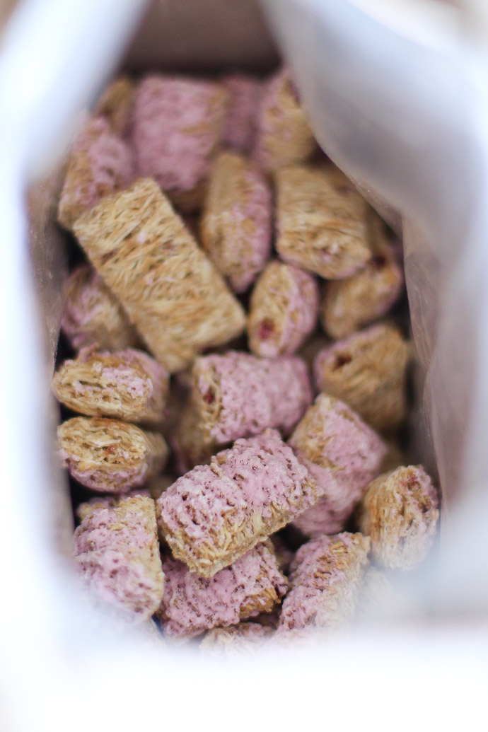 - Add half of the Post Shredded Wheat Frosted Mixed Berry